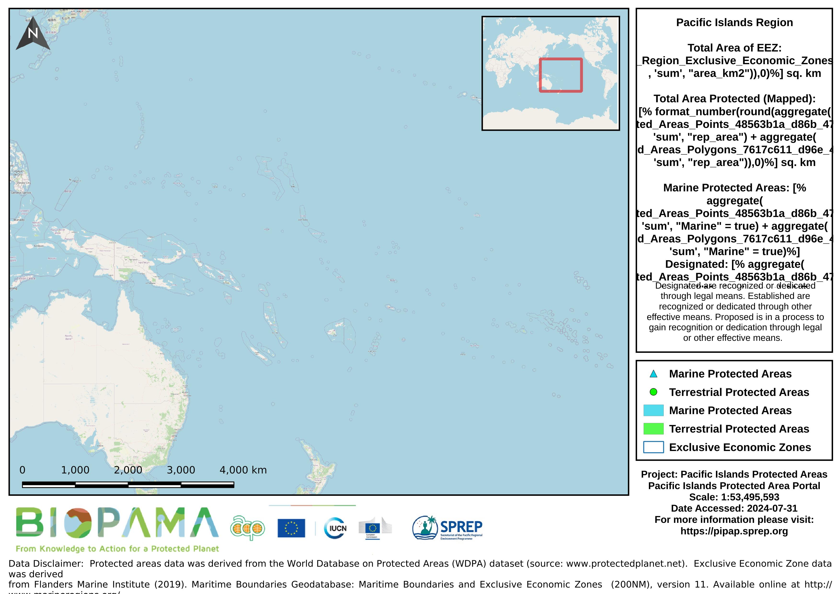 Map of the protected areas for the Pacific Islands Region with regional-level summary statistics on the amount of area under protection, count for each type of protected area (terrestrial or marine), and the count of their designation.